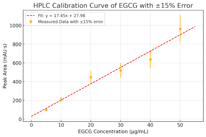 EGCG was extracted from green tea leaves using ultrasound-assisted extraction (UAE) with a 70% ethanol/30% water solvent system at a solid-to-liquid ratio of 1:30 (2 g/60 mL). Ultrasound conditions: 40 kHz, 150 - 250 W, 50 C, 45 min, repeated 3 times. Extracts were filtered, vacuum-concentrated, and analyzed via HPLC (C18 column, λ = 280 nm). The EGCG content was calculated using a calibration curve (y = 17.45x + 27.98), and the total EGCG yield was 10.03 mg per 2 g of tea (≈5.01 mg/g).