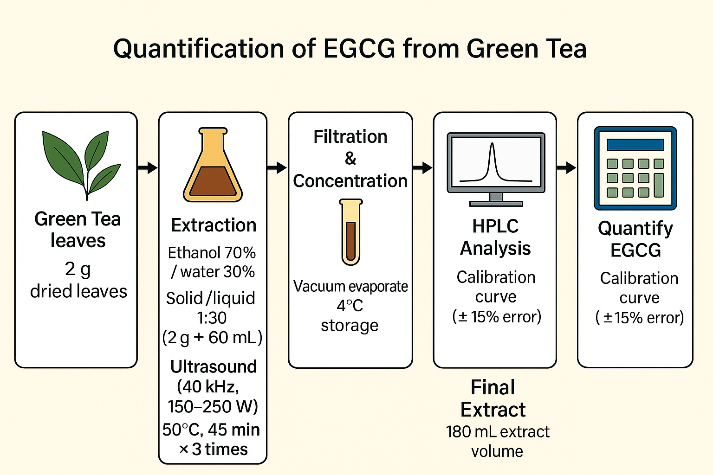 Figure 1 Schematic diagram of EGCG quantification process from green tea leaves using ultrasound-assisted extraction and HPLC analysis.