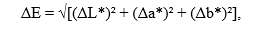 Visual color changes were quantified using a digital colorimeter and analyzed in terms of CIE Lab* coordinates (L*, a*, b*). The color difference (ΔE) was calculated using the equation: