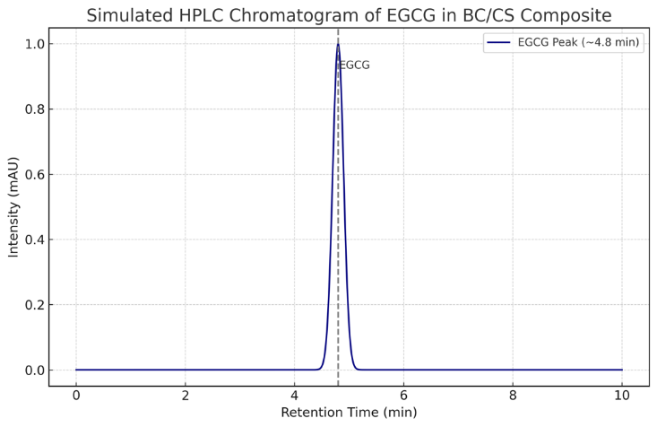 Quantitative determination of EGCG was performed using high-performance liquid chromatography (HPLC). The HPLC system was calibrated using standard EGCG solutions, generating a calibration curve with an allowable error margin of ± 15%. Analytical conditions typically include: