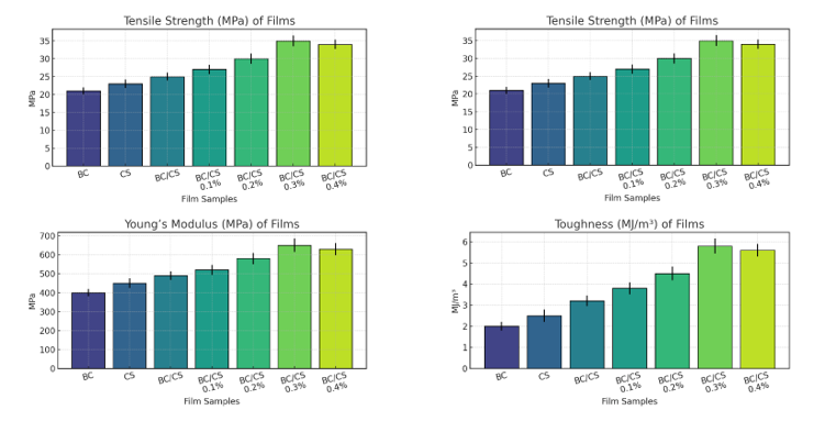 The tensile strength, elongation at break, Young’s modulus, and toughness of the composite films were measured using a universal testing machine (UTM). Films were cut into standard rectangular strips (typically 10×50 mm2), conditioned at 25 C and 50% RH before testing, and stretched at a crosshead speed of 5 mm/min. The mechanical parameters were calculated from the resulting stress-strain curves.