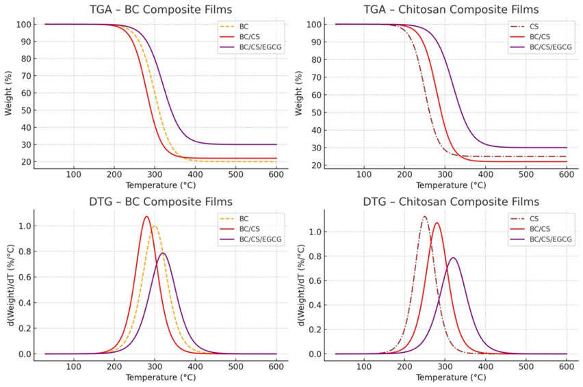 Thermogravimetric analysis (TGA) and derivative thermogravimetry (DTG) were conducted using a thermal analyzer under nitrogen atmosphere. Approximately 5 to 10 mg of each film sample was heated from room temperature to 600 C at a rate of 10°C/min. The onset degradation temperature (Tₒₙₛₑₜ), peak degradation temperature (Tₘₐₓ), and residual weight (%) were recorded to determine thermal stability.