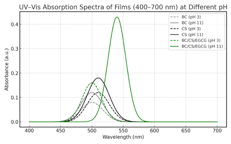 From Table 5 and Figure 15, the outstanding pH-sensing performance of the EGCG-integrated composite film is clearly demonstrated. The BC/CS/EGCG film exhibits a pronounced color change from yellow to brown/green as the pH increases from 3 to 11, whereas the BC and CS films show little to no visible changes. Notably, the absorbance at 510 nm significantly increases from approximately 0.13 to 0.48 a.u., indicating a strong sensitivity to environmental pH. The color transition is primarily attributed to mild oxidation of EGCG and molecular structural shifts driven by π π stacking interactions. These findings confirm EGCG’s central role in enabling pH responsiveness and highlight the composite film’s potential as an intelligent food packaging material that can visually monitor product quality and freshness through color changes.