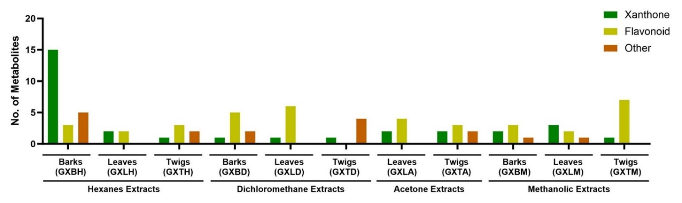 Figure 2 Metabolite distribution in G. xanthochymus crude extracts. A bar graph shows the number of xanthone, flavonoid, and other identified in crude extracts from each part in different solvents.