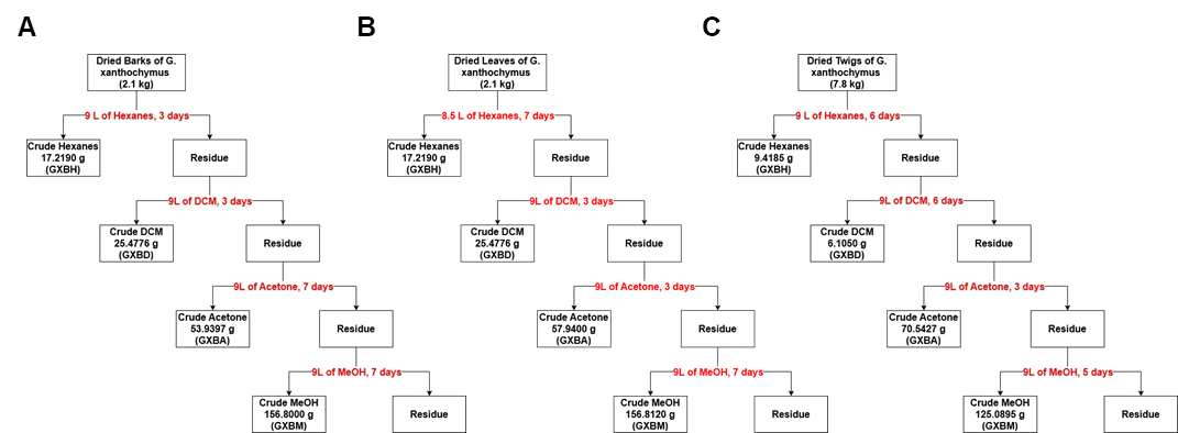Figure 1 The extraction scheme of (A) barks, (B) leaves, and (C) twigs of G. xanthochymus with organic solvent hexanes, dichloromethane (DCM), acetone, and methanol (MeOH).