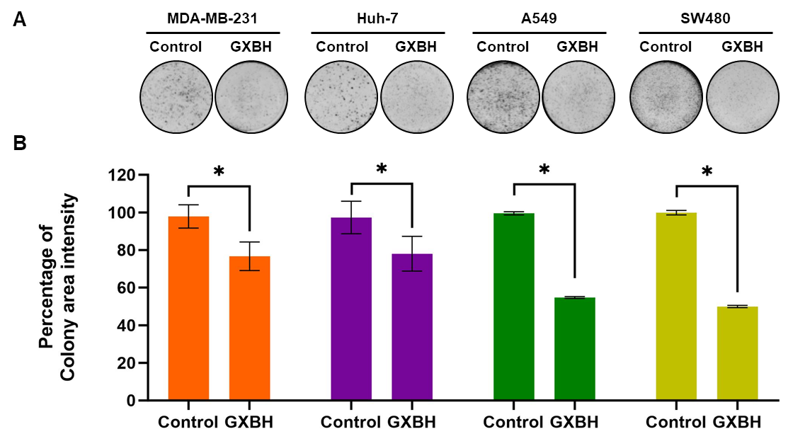 Figure 5 Clonogenic assay of human cancer cell lines after treatment with GXBH for 96 h. (A) Representative images of formed colonies of MDA-MB-231, Huh-7, A549, and SW480. (B) Bar graphs show the percentage of colony area intensity of MDA-MB-231, Huh-7, A549, and SW480. Data represent mean ± SD from 3 independent experiments. *P < 0.05 vs. control (0 μg/mL).