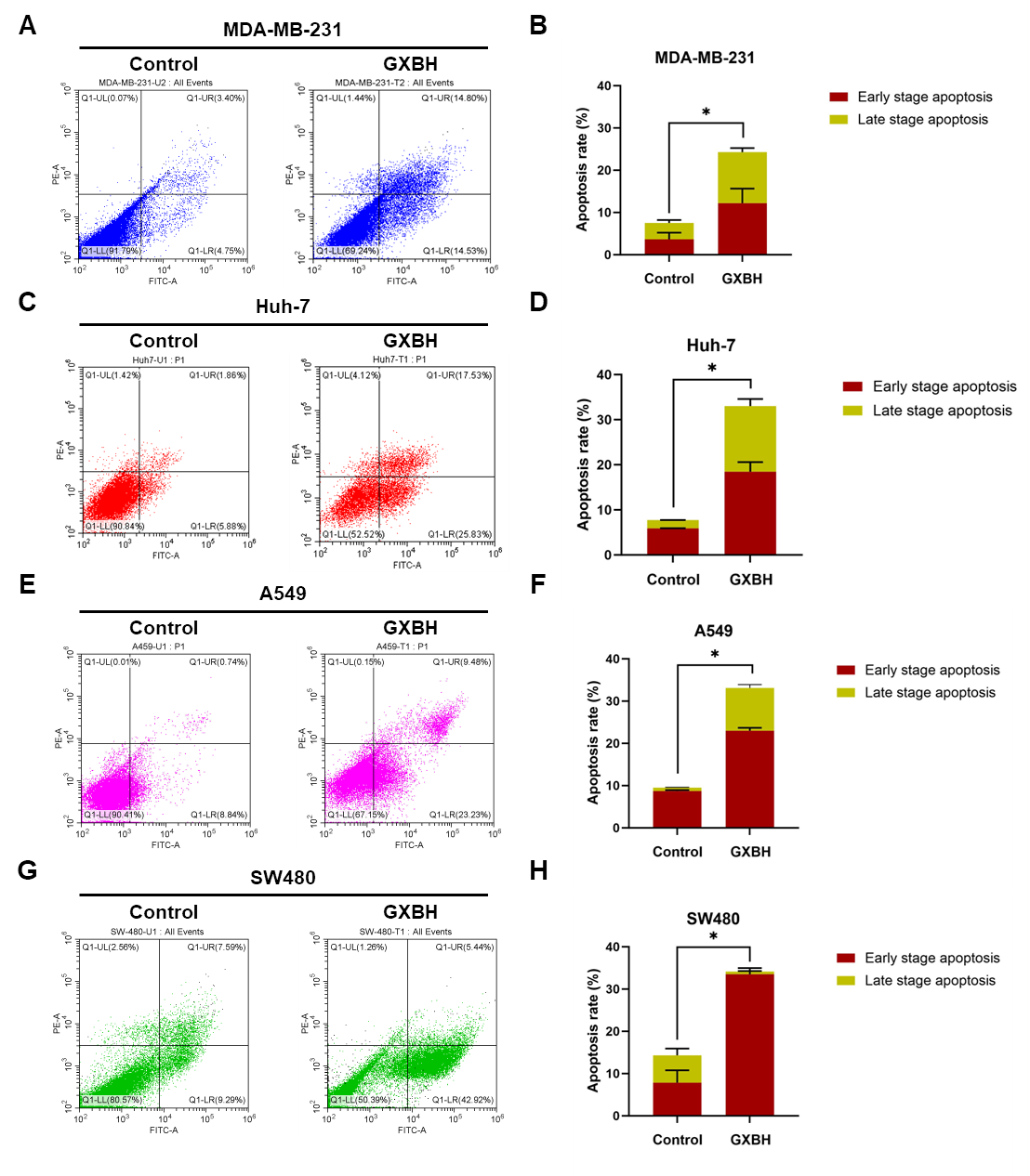 Figure 4 Annexin V and PI staining assay of human cancer cell lines after treatment with GXBH for 96 h. Representative flow cytometric dot plots of annexin V and PI-stained cells in MDA-MB-231 (A), Huh-7 (C), A549 (E), and SW480 (G). Bar graphs show the percentage of apoptotic cells in MDA-MB-231 (B), Huh-7 (D), A549 (F), and SW480 (H). Data represent mean ± SD from 3 independent experiments. *P < 0.05 vs. control (0 μg/mL).
