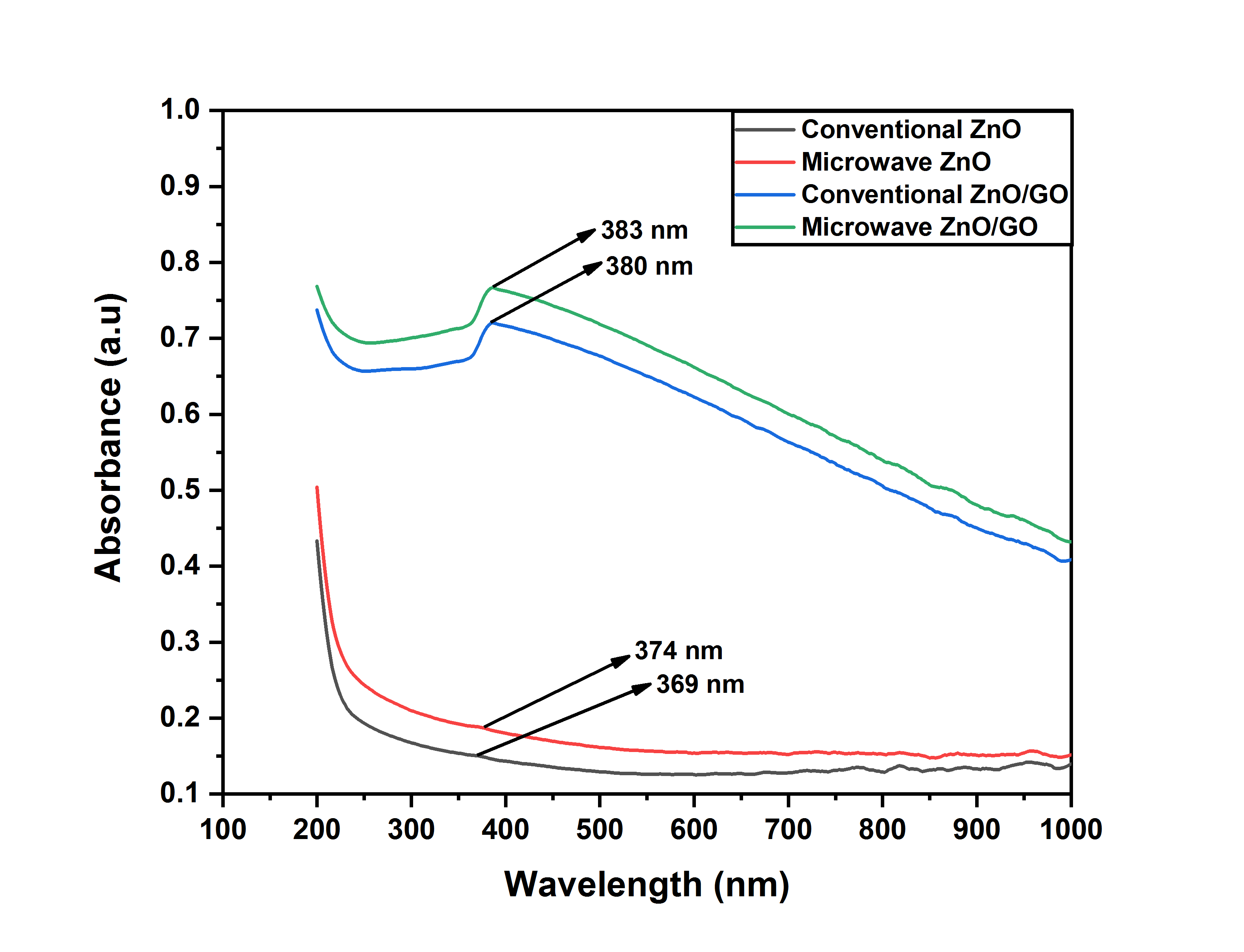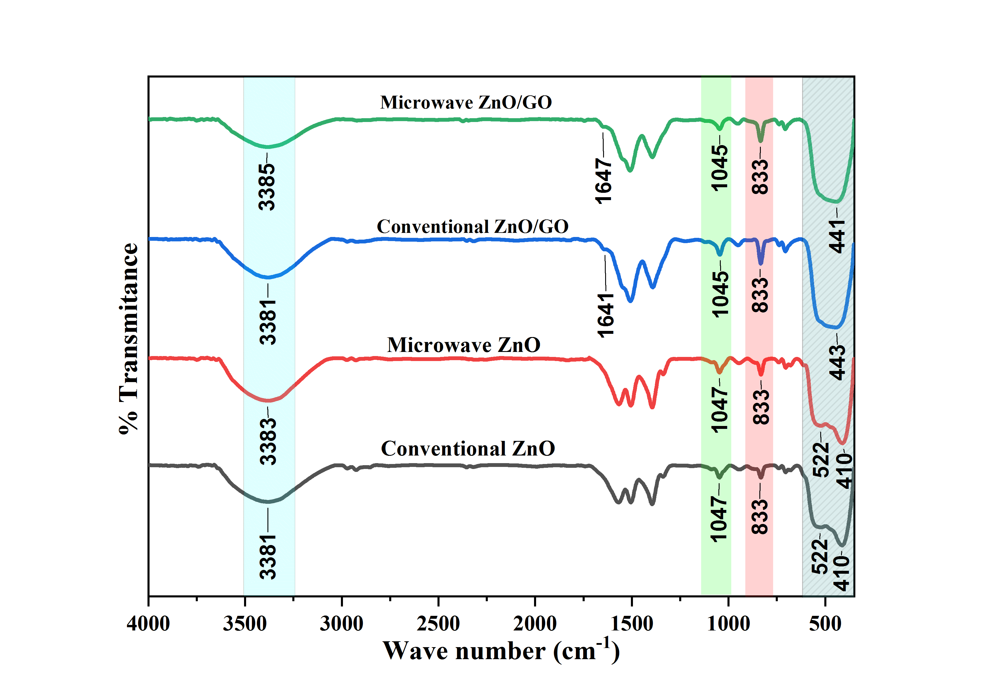Modified microwave reactor heating produced significantly larger crystal sizes (90.3 nm for ZnO and 55.6 nm for ZnO/GO) compared to conventional heating. This difference can be attributed to the increase in temperature, which is influenced by the loss tangent (tan δ = ε”/ε’) where ε’ and ε” represent the real and imaginary components of the permittivity constant, respectively. In the work of Yuwen et al. [22], GO has a lower tan δ value (about 0.03) than ZnO (about 0.0529) as reported by Horikoshi et al. [23]. The lower tan δ value of GO results in less efficient absorption of microwave energy, thereby slowing down the heating process and consequently limiting the growth rate of ZnO particles in the ZnO/GO composite. Nonetheless, the crystal size of modified microwave reactor heated ZnO/GO is still larger than that of conventional heating, although, the difference is not very noticeable compared to pure ZnO.