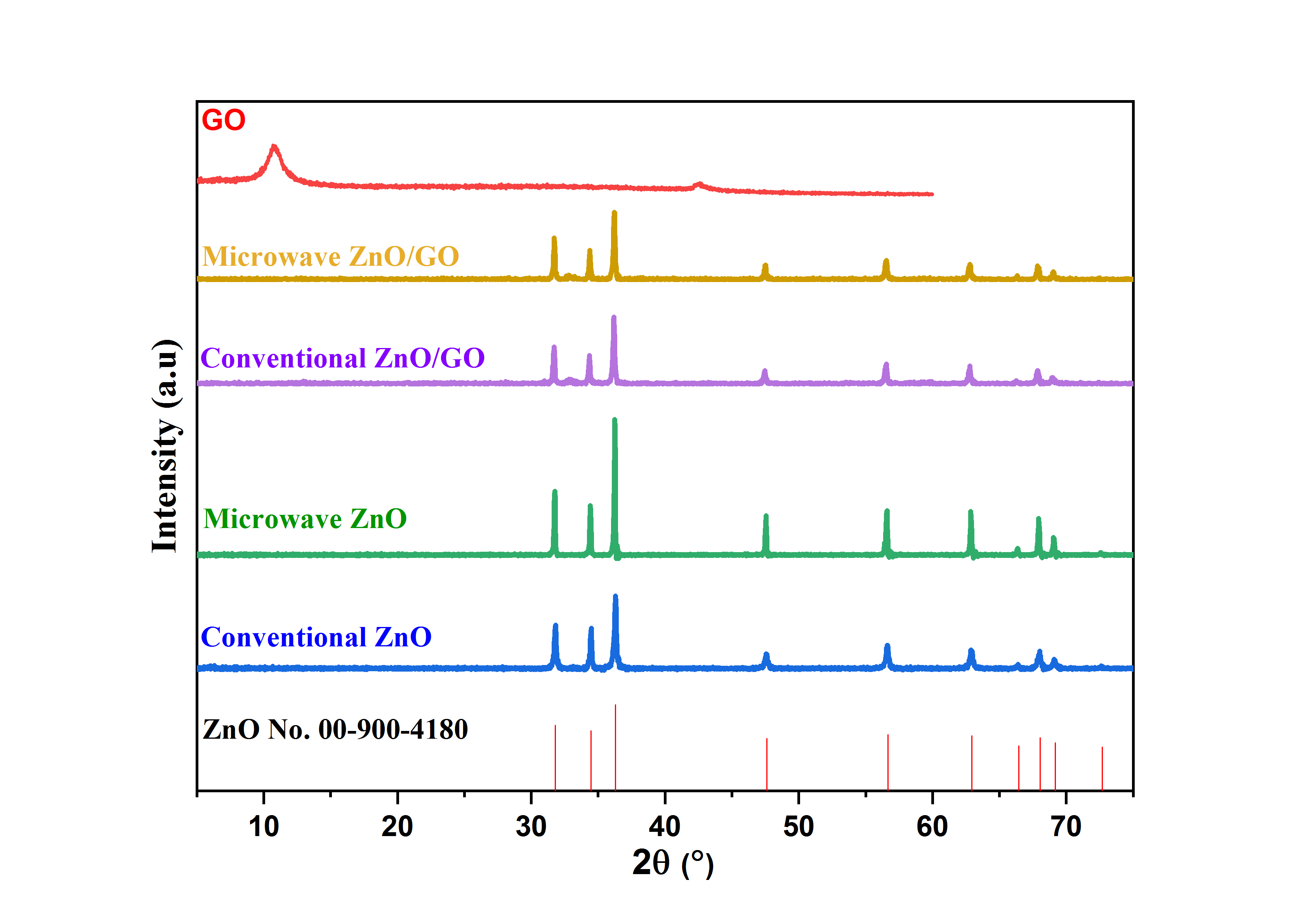 As reported by Kachere et al. [27], although different heating techniques lead to variations in diffraction peak intensity, samples heated using microwaves exhibit higher peak intensities. This indicates that microwave heating produces crystalline structures of superior quality, due to improved crystallinity and phase homogeneity. It was observed that conventionally heated ZnO showed a larger crystallite size compared to the ZnO/GO nanocomposite. This can be attributed to the interaction between ZnO nanoparticles and GO, which induces a restructuring process. The interaction promotes crystallite growth resulting in an overall increase in ZnO crystal size [28].