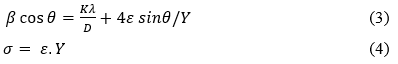Dislocation density is a measure of the number of dislocation line defects within crystalline material per unit volume or area. It is usually defined as the total length per unit volume, or equivalently, as the number of dislocations intersecting an area in a plane. The number crossing between 2 parallel surfaces divided by their separation. Dislocation density is a key material as parameter, since it has profound effects on the mechanical properties of materials such as strength and ductility. Dislocation density (ẟden) mathematically calculated using Equation ẟden = 1/D2 [29], where D represents crystallite size [30].