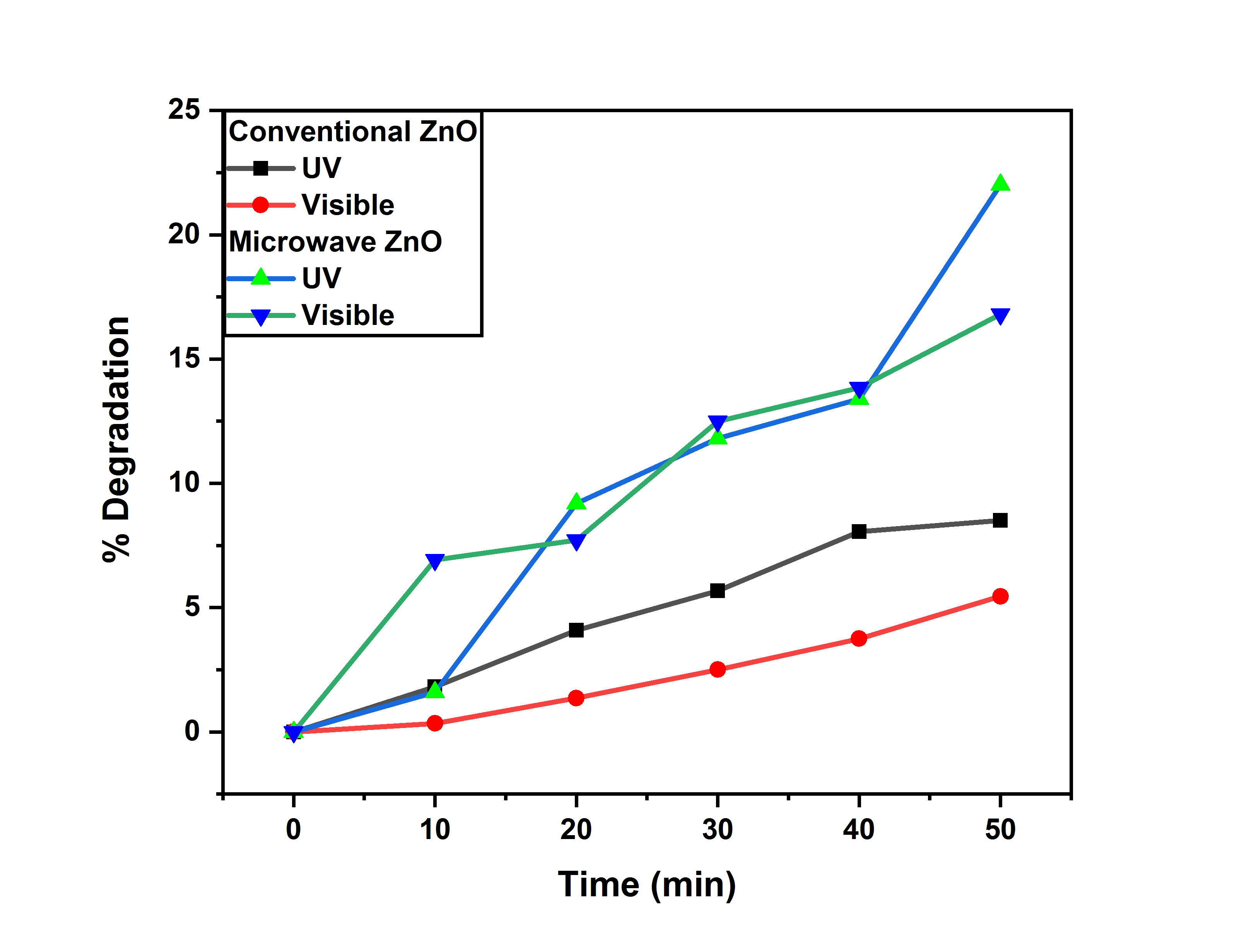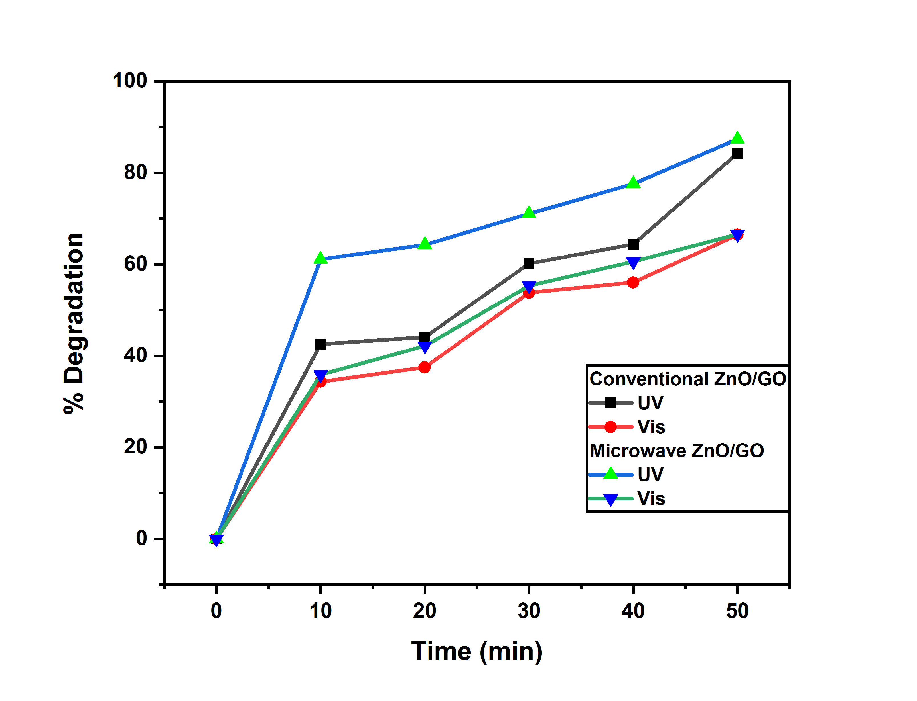 The photocatalytic degradation process using ZnO and ZnO/GO nanocomposites was conducted under UV (365 nm, 10 mW/cm2) and visible light (420 - 700 nm, 50 mW/cm2) irradiation with a 300 W Xenon lamp with appropriate filters. The reaction progress was monitored via UV-Vis spectrophotometry by measuring the absorbance of MB at a wavelength of 664 nm. A total of 10 mg of each ZnO and ZnO/GO was used as photocatalysts in 10 mL of MB solution with a concentration of 10 ppm. Degradation rate measurements were taken at 10, 20, 30, 40, and 50 minutes.