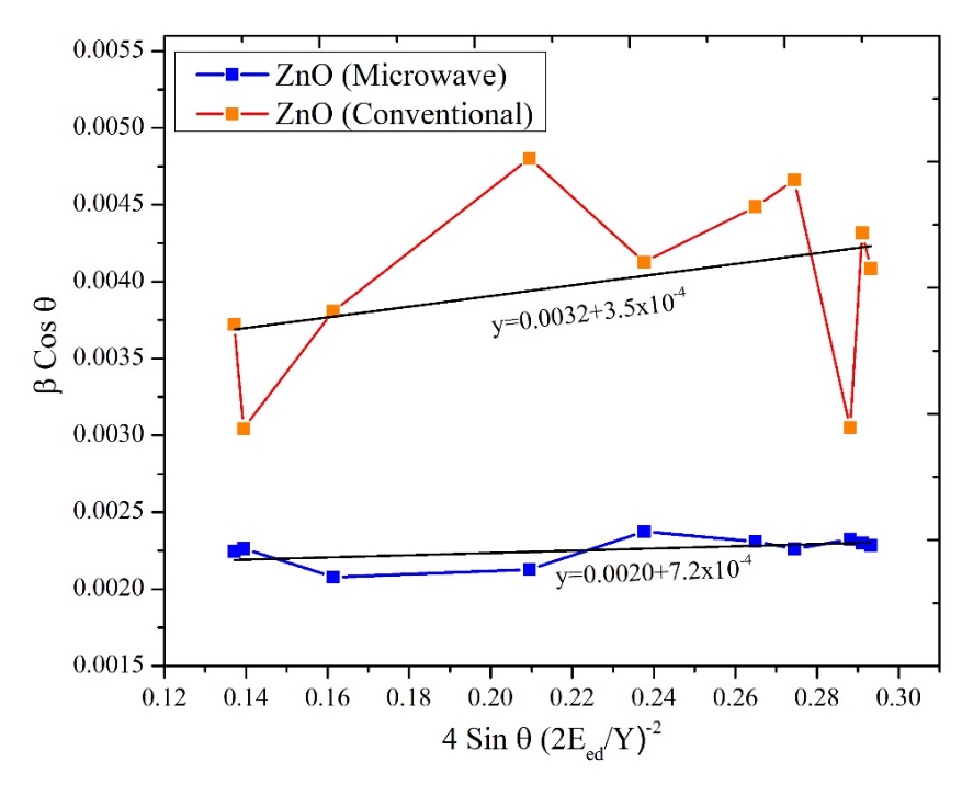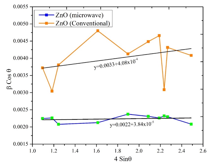 The values of β cos θ on the y-axis were plotted as a function of 4 sin θ on the x-axis, and from the linear fit of the data, the microstrain ε was estimated from the slope of the linear fit (Figure 3). Based on the results shown in Figure 3, the microstrain for ZnO nanoparticles synthesized by the conventional method is 4.08×10−4, while for those synthesized using the modified microwave reactor method is 3.84×10−5. These results indicate that ZnO nanoparticles synthesized by the microwave method have a better crystal structure compared to those synthesized by the conventional method. This is also supported by the higher intensity of ZnO nanoparticles synthesized by the modified microwave reactor method, similar to the findings of Kumar et al. [32].