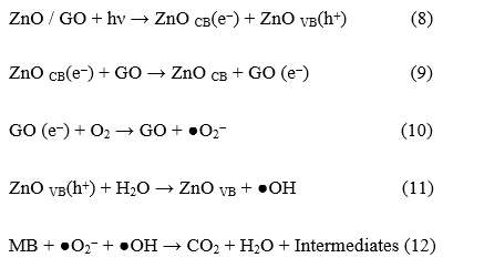 Based on the experimental results, the proposed mechanism for the photocatalytic degradation of organic dyes using the ZnO/GO photocatalyst (Figure 10) follows the pathway suggested by Puneetha et al. [44].