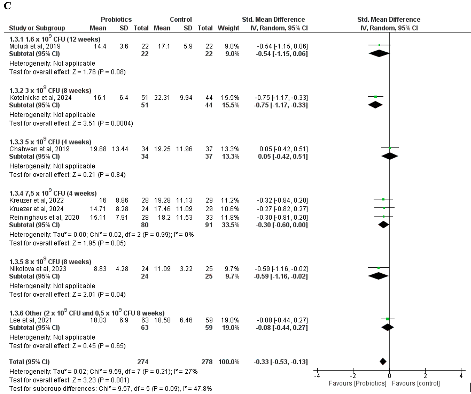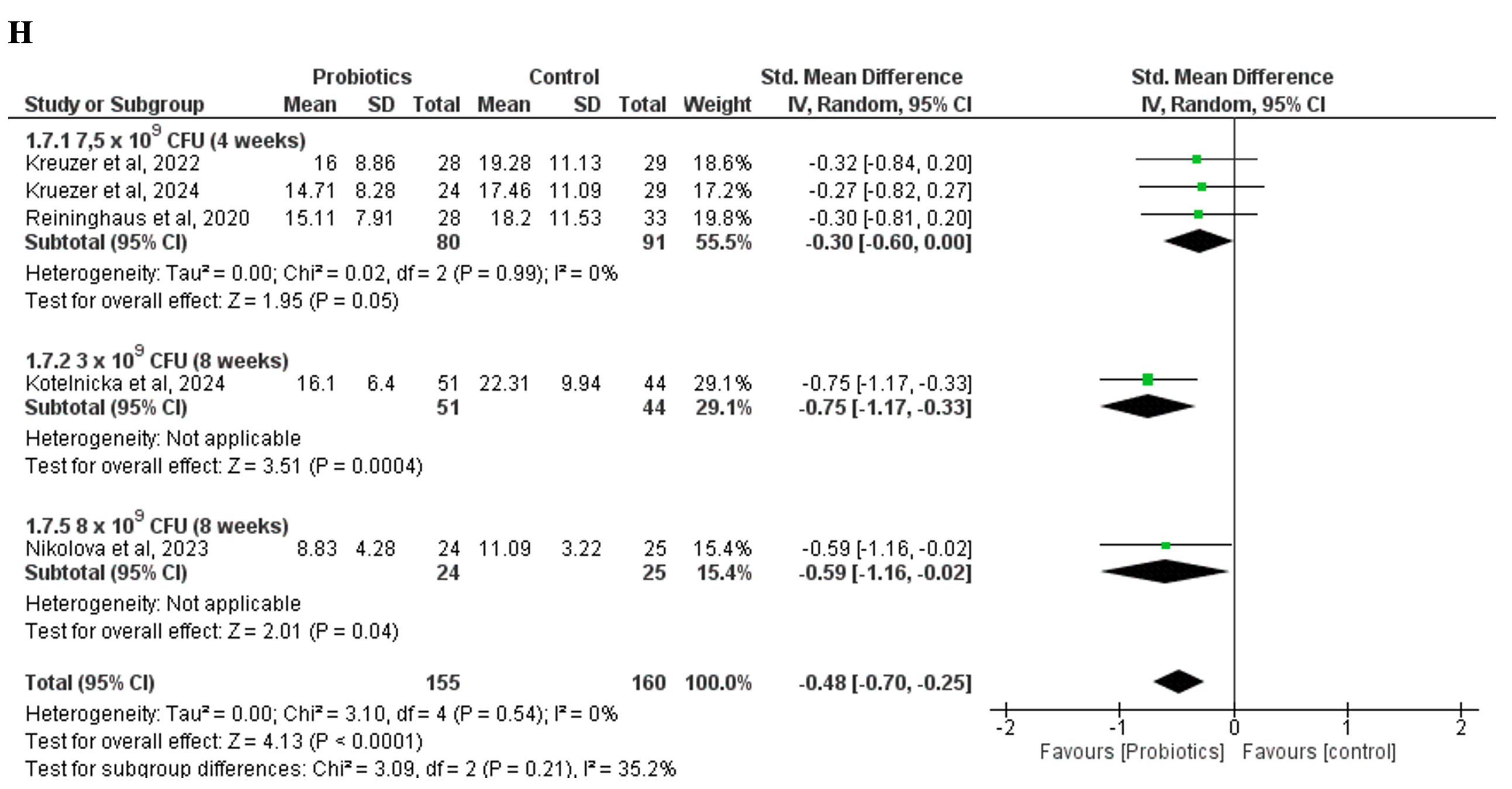 The next subgroup analysis, evaluating the effectiveness of probiotics as adjunctive therapy in depressive disorders to reduce depressive symptoms based on daily dose and duration (G), showed very significant results for a 3×109 CFU dose over 8 weeks (SMD = −0.75, 95% CI −1.17 to −0.33, p = 0.0004).