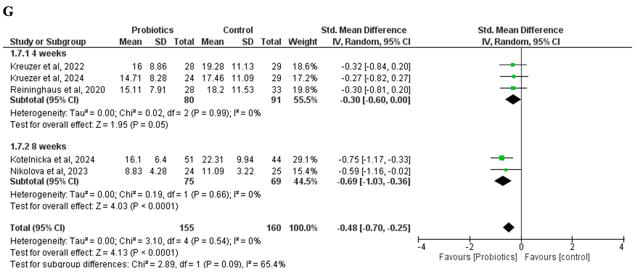 Subgroup analysis of probiotic treatment duration in individuals with depressive disorders (F) demonstrated significant findings, particularly at 8 weeks (SMD = −0.69, 95% CI −1.03 to −0.36, p < 0.0001).