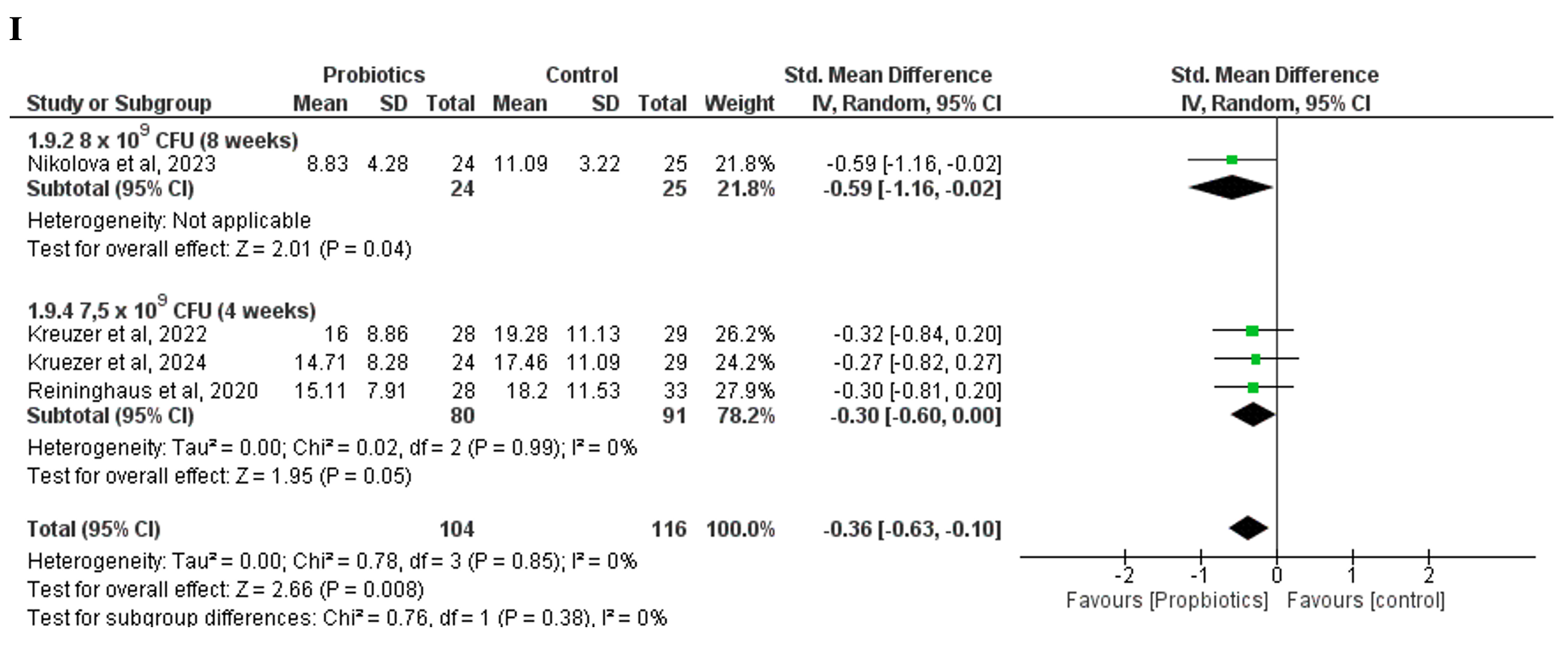 The last analysis involving major depressive disorder (MDD) (H) yielded significant findings with dose of 8×109 CFU (SMD = −0.59, 95% CI −1.16 to −0.02, p = 0.04).