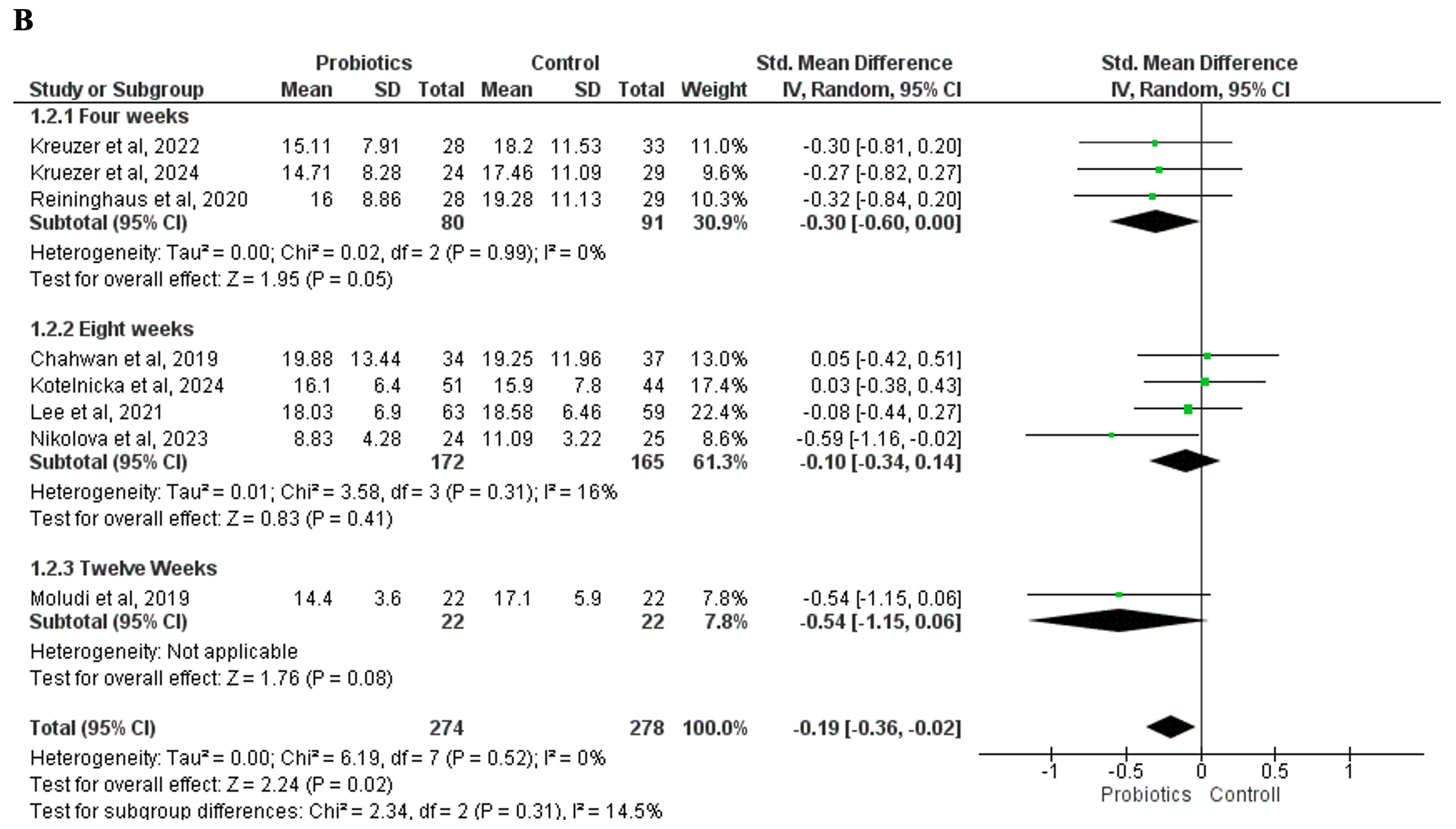 The results of this study indicate that probiotics are effective in reducing symptoms of depression, particularly in individuals with depressive disorders, suggesting their potential use as an adjunct therapy for depression sufferers. Most studies have reported that probiotics can alleviate symptoms of depression, and specifically among those with depressive disorders, probiotics appear to be a promising additional therapy for symptom reduction. However, no standardized protocol for administering probiotics regarding duration and dosage is available. Our analysis demonstrated a significant reduction in depressive symptoms with probiotics administered for 4 and 12 weeks but not for 8 weeks, likely due to data heterogeneity across studies. To address this heterogeneity, we conducted a subgroup analysis focusing on studies involving samples of depression sufferers who were also taking antidepressants. The results showed a significant reduction in depressive symptoms after 8 weeks of probiotic administration in individuals with depression who were taking antidepressants. This finding aligns with recommendations from studies suggesting a minimum probiotic treatment duration of 8 weeks for optimal efficacy [4].