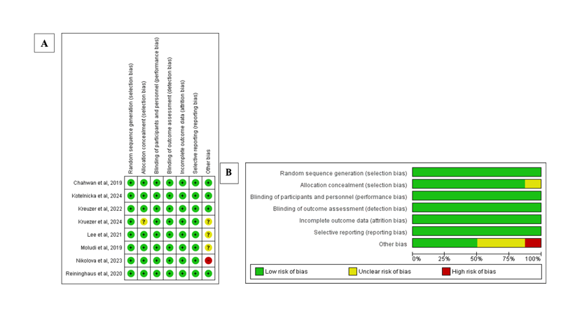 It is not applicable, as this study is a quantitative meta-analysis rather than qualitative research. However, the quality of the included studies was assessed using the Cochrane Risk of Bias Tool, which evaluates bias in several domains: random sequence generation, allocation concealment, blinding of participants and personnel, blinding of outcome assessment, incomplete outcome data, and selective reporting. Each study was classified as having a low, high, or unclear risk of bias [11,12]. In this study, 2 reviewers (author 1 and author 2) independently assessed the risk of bias, and disagreements were resolved by a third reviewer (author 3).
