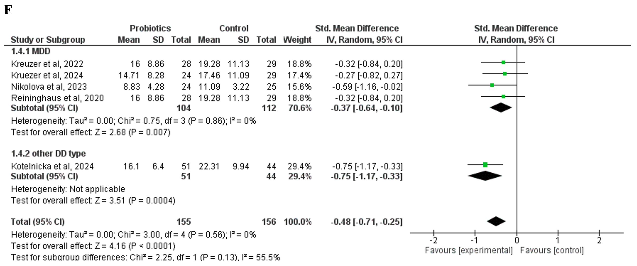The subsequent analysis of patients with depressive disorders who were on antidepressant medications (E) indicated that probiotics significantly alleviated depressive symptoms (p < 0.0001). Subgroup analysis of other depressive disorders (mild and moderate) revealed an SMD of −0.75 (95% CI −0.17 to −0.33, p = 0.0004), while in major depressive disorder (MDD), the result was SMD = −0.37 (95% CI −0.64 to −0.10, p = 0.007).