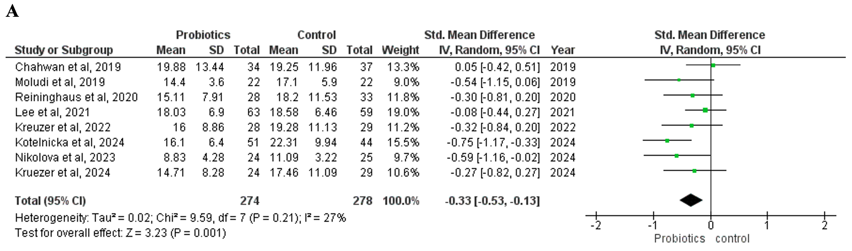 This meta-analysis synthesizes data from multiple RCTs that employed various probiotic interventions. The specific interventions varied across studies, including different probiotic strains, dosages, and administration durations. All included studies featured a control group that received either a placebo or standard treatment for depressive disorders, depending on the study design.