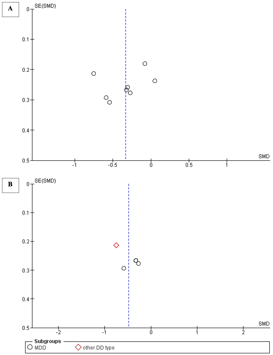 Figure 4 Funnel flow analysis showed low heterogeneity and slight publication bias among the studies of MDD (A) and other DD types (B).