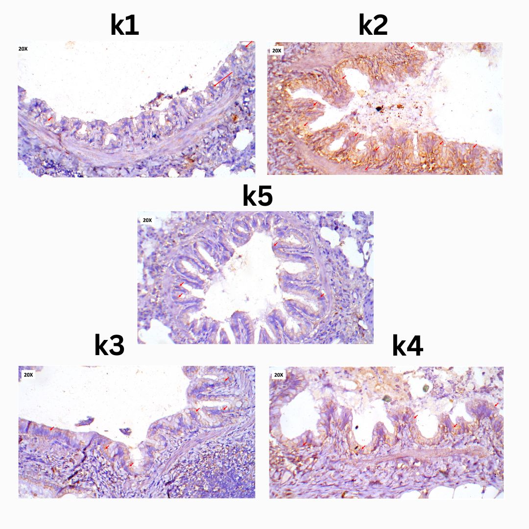 Figure 8 shows the comparison of TGF-β expression in bronchial epithelium through IHC staining in various treatment groups. The brown staining in the cytoplasm (indicated by the red arrow) illustrates areas with positive TGF-β expression. The highest expression was found in the K2 group (chronic asthma model) with 90% of the cytoplasmic area positive, while the lowest expression was found in the K1 group (healthy control) with 5% of the positive area. The combination group of prednisolone and FEAUJU (K5) is effective in significantly reducing TGF-β expression in the bronchial epithelium, approaching the healthy control group. This confirms the role of combination therapy in suppressing inflammation in chronic asthma.