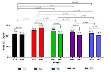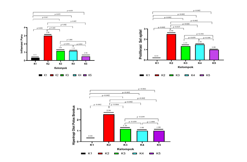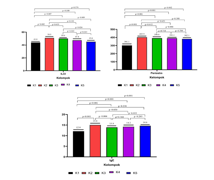 Figure 5 It is known that the mean levels of IL-33, periostin and IgE in the K2, K3, K4 and K5 groups are higher than in the healthy K1 group. The analysis results show that the average levels of IL-33, periostin and IgE in the healthy group (K1) were significantly different from the groups induced with OVA as an asthma model (K2, K3, K4 and K5) with all p-values < 0.001. The results indicate that the administration of OVA significantly affects the increase in the levels of IL-33, periostin and IgE indicators. Furthermore, the results indicate that there are no differences in the average levels of IL-33, periostin and IgE among the asthma model groups/OVA-induced groups (K2, K3, K4 and K5) with p-values > 0.05. The results indicate that the average levels of IL-33, periostin and IgE in the asthma model groups were the same and comparable from the beginning before treatment with the ethyl acetate fraction of purple sweet potato. Significant differences were still found between K2 and K3 in IgE (p-values = 0.004), K2 and K4 (p-values = 0.030), however, the increase in IgE levels in K5 was already the same and comparable (p-values = 0.238). In IL-33, significant differences were also found between K2 and K5 (p-values = 0.009) and K3 and K5 (p = 0.024), with an increase observed in K4 (p-values = 0.263). Based on these results, the levels of IL-33 and IgE in the asthma model group can be considered comparable from the beginning.