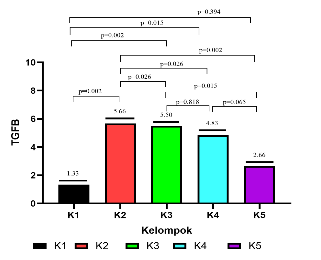 Figure 7 Shows that the average expression of TGF-β in bronchial tissue after FEAUJU treatment. The research results show a significant variation among the treatment groups. The K2 group showed the highest average TGF-β expression, with an average of 5.66, indicating a high TGF-β expression. On the other hand, the lowest average TGF-β expression was found in the K5 group with an average of 2.66. This decrease indicates the effectiveness of the treatment combination in suppressing TGF-β expression, approaching normal levels.