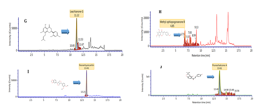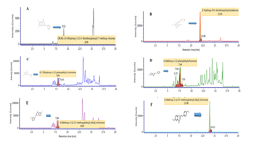 Explanation: (A) Retention Time (RT) of (3R,4S)-3,4-Dihydroxy-3-(3′,4′-dimethoxybenzyl)-7-methoxy-chroman at 9.12 min. (B) Retention Time (RT) of 2′-Hydroxy-4′,6′-dimethoxydihydrochalcone at 12.08 min (C) Retention Time (RT) of 6,7-Dihydroxy-2-(2-phenylethyl) chromone at 7.84 min. (D) Retention Time (RT) of 6-Methoxy-2-(2-phenylethyl) chromone at 7.64 min. (E) Retention Time (RT) of 6-Methoxy-2-[2-(3'methoxyphenyl) ethyl] chromone at 8.05 min. (F) Retention Time (RT) of 6-Methoxy-2-[2-(4'methoxyphenyl) ethyl] chromone at 13.98 min. (G) Retention Time (RT) of Leachianone G at 11.22 min. (H) Retention Time (RT) of Methyl ophiopogonanone B at 6.85 min. (I) Retention Time (RT) of Noranhyoicaritin at 13.41 min and (J) Retention Time (RT) of Porachalcone A at 13.61 min.