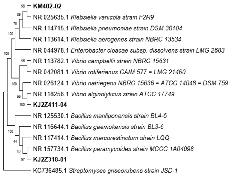 Phylogenic tree construction was used to determine the species-relatedness of potential isolates. The phylogenetic tree was constructed using the neighbor-joining method to provide the best estimate of the length of the closest branch that reflects the distance between sequences [35] and then statistically tested using a bootstrap of 1,000 replicates to test the topological validity of the phylogenetic tree [36]. Bootstrap is categorized as strong if > 85%, moderate 70% - 85%, weak 50% - 70%, and poor < 50% [37]. The results of phylogeny tree construction show bootstrap with strong validity. Isolate KM402-02 is K. variicola strain F2R9 with bootstrap 98, closely related to K. pneumoniae strain DSM 30104 with bootstrap 89. Isolate KJ2Z411-04 is V. alginolyticus strain ATCC 17749 with bootstrap value 100, closely related to V. natriegens NBRC 15636 with bootstrap 99. Isolate KJ2Z318-01 is B. paramycoides strain MCCC 1A04098 with bootstrap value 97.