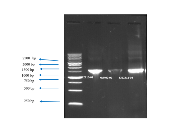 Bacteria demonstrating antagonistic activity against MDR bacterial growth were subsequently identified using molecular methods. DNA extraction from tunicate-associated bacteria followed the Quick-DNA™ Fungal/Bacterial Miniprep Kit protocol. The extracted DNA was then amplified by PCR using universal primers 27F (5’-AGAGTTTGATCMTGGCTCAG-3’) and 1492R (5’-GGTTACCTTGTTACGACTT-3’) to obtain the 16S rDNA sequence. The PCR mixture consisted of 2 µL DNA template, 1 µL primer 27F, 1 µL primer 1492R, 8.5 µL ddH2O, and 12.5 µL GoTaq Green Master Mix, resulting in a total volume of 25 µL. Amplification was carried out with a BIO-RAD T100 Thermal Cycler. The PCR conditions used in this study were as follows: Initial denaturation at 95 C for 3 min, followed by 30 cycles of denaturation at 95 C for 1 min, annealing at 54 C for 1 min, and extension at 72 C for 1 min 30 s, with a final extension at 72 C for 7 min [14]. The DNA amplification results were observed using gel electrophoresis. A 1 % agarose gel was prepared by dissolving 1 %w/v agarose in 1X TBE buffer using a microwave. While in the liquid phase (warm temperature), 1% agarose was mixed with Gel Green Nucleic Acid Stain (as an alternative to EtBr) before pouring into the mold. The 16S rRNA PCR products and a DNA marker, each 3 µL, were mixed with 2 µL of loading dye and loaded into the wells of the 1% agarose gel submerged in 1X TBE buffer solution. Electrophoresis was conducted at 100 V for 30 min, and the gel was visualized using a gel documentation system.