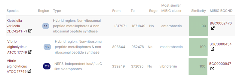 The 2nd information is that Vibrio alginolyticus species likely share the same gene cluster as Vibrio alginolyticus ATCC 17749 (Figure 7). Gene cluster region: 1.2; Type: Hybrid region consisting of non-ribosomal metallophore peptide and non-ribosomal synthase peptide (NRPS), Nucleotide positions 893,644 to 952,478; Edge: “No” (indicating the cluster is not on the edge of a contig, so it is most likely intact); MIBiG cluster most similar: Vanchrobactin; Similarity: 100% (perfect match to known MIBiG cluster) MIBiG BGC ID: BGC0000454.