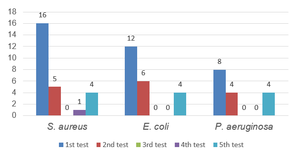 The results of sensitivity testing of MDR bacteria to various antibiotics (Appendix 1) by the microbiology laboratory of Dr. Kariadi Hospital Semarang showed that S. aureus was resistant to 9 out of 16 antibiotics tested and identified as Methicilin Resistant Staphylococcus aureus (MRSA). E. coli was resistant to 13 out of 22 antibiotics tested and identified as ESBL (extended-spectrum beta-lactamases) producing E. coli. P. aeruginosa was resistant to 8 antibiotics tested, identified as P. aeruginosa MDR. Bacterial resistance testing against antibiotics is carried out based on the minimum inhibitory concentration (MIC). MIC is the lowest concentration of antibacterial agent expressed in mg/L (µg/L), strictly controlled under in vitro conditions that completely prevent the growth of a test strain of an organism [24]. MIC has similarities with ZOI in qualitative methods, namely the interpretation of the sensitivity and resistance of the pathogen to the given antibiotic.