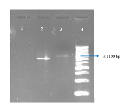 The amplification results of PKS-1 and NRPS genes were confirmed using gel electrophoresis. The PKS-1 gene has a size of 1,100 bp, while the NRPS gene is 800 bp. PKS-1 gene detection of 3 potential isolates can be seen in Figure 6. The visualization results of the PKS-1 gene band show the appropriate base length of ± 1,100 bp compared to the 1 kb DNA ladder. PKS-1 gene was successfully detected in Klebsiella variicola strain F2R9 and Vibrio alginolyticus strain ATCC 17749. NRPS genes from 3 potential isolates were not successfully detected. The presence of PKS-1 and NRPS genes from isolates whose species names are known can be traced using the antiSMASH database which can be accessed via https://antismash-db.secondarymetabolites.org/browse based on the taxa of the related bacterial species.