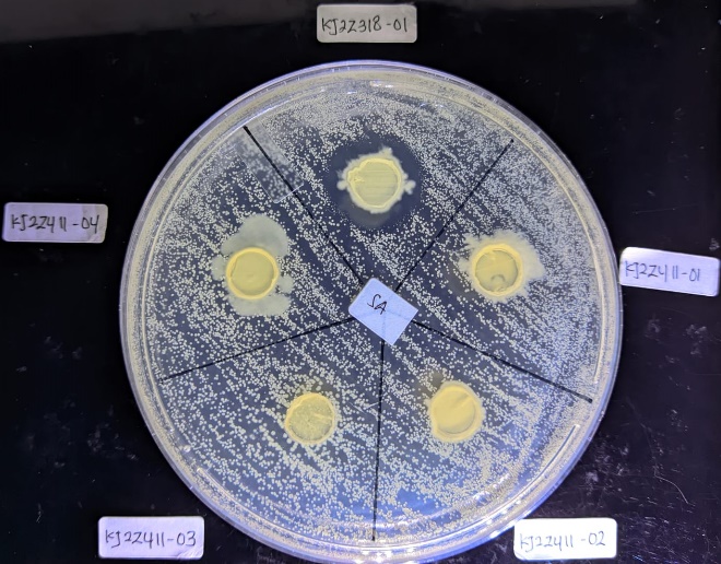 Antibacterial activity screening was conducted using the plug agar method [14]. A loopful of each MDR bacteria strain (E. coli, S. aureus, and P. aeruginosa) was transferred to NB medium and shaken overnight at 120 rpm. The overnight MDR bacterial culture (approximately 20 h) was then diluted with sterile distilled water to turbidity matching the 0.5 McFarland standard, equivalent to 1×108 CFU/mL. The 0.5 McFarland bacterial suspension was spread onto the surface of the MHA medium using a cotton swab. Overnight cultures of bacterial isolates on M1 or Zobell medium were punctured with a sterile blue microtip and then placed onto the surface of the MHA medium that had been swabbed with MDR bacteria. Antagonistic testing of the bacteria was performed in duplicate and incubated at 37 C. Antibacterial activity was indicated by the formation of an inhibition zone (clear zone) on the test medium. The clear zone diameter was measured using calipers after 24 h and again at 48 h.