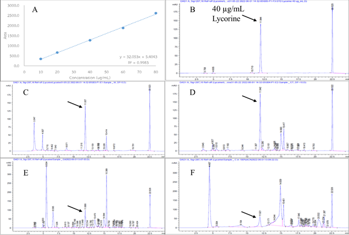 Figure 1 Standard curve of lycorine and its HPLC chromatogram from each extract. (A) Standard curve of lycorine. (B) HPLC chromatogram of standard lycorine. (C) HPLC chromatogram of lycorine from AQE. (D) HPLC chromatogram of lycorine from ETE. (E) HPLC chromatogram of lycorine from EAE. (F) HPLC chromatogram from CFE.