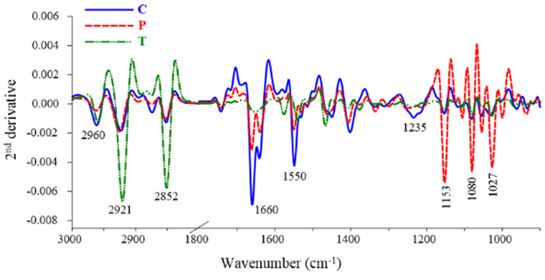 The FT-IR spectra further corroborated these observations by revealing distinct biochemical changes in B. subtilis cells after treatment. Tetracycline treatment led to increased intensities in nucleic acid and polysaccharide bands, along with decreased signals in protein amide I, II, III, phospholipid, and ester-lipid regions. These changes reflect its known mechanism of action—inhibiting protein and DNA synthesis by binding to the ribosomal A site—which results in reduced protein expression and nucleic acid accumulation. The observed increase in polysaccharide bands may also indicate enhanced exopolysaccharide production, potentially as a protective biofilm barrier to limit antibiotic penetration [27,28]. In contrast, ETE treatment induced broader biochemical alterations. FT-IR peak area analysis showed significant shifts in lipid CH stretching, protein amide, and nucleic acid-associated regions, suggesting that ETE disrupts membrane integrity, denatures proteins, and damages nucleic acids. These findings highlight that ETE exerts antimicrobial effects through mechanisms distinct from those of tetracycline.