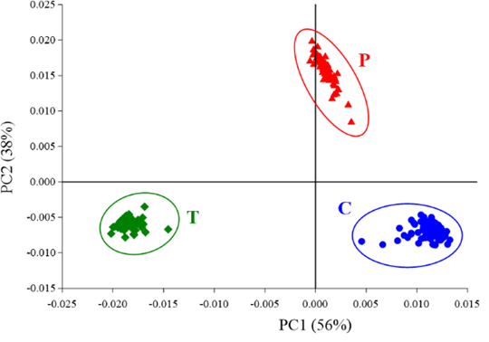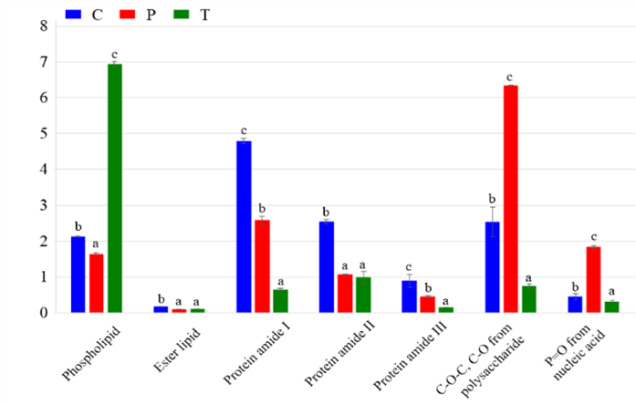 Note: Sample C is control or untreated cells, sample P is positive control or tetracycline treated cells, and sample T is testing sample or ETE treated cells. The a, b, and c are significant difference between samples C, P, and T when p-value < 0.05.
