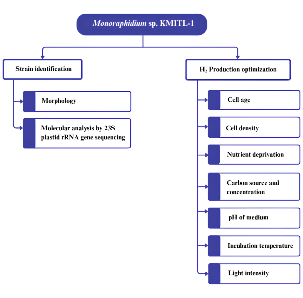 Figure 1 Flowchart illustrating the process of strain identification and optimization of H2 production by the unicellular green alga Monoraphidium sp. KMITL-1.