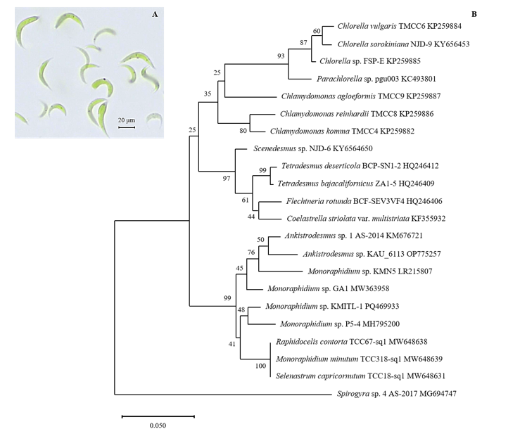 In this study, Monoraphidium sp. KMITL-1 was identified using both morphological and molecular analyses. Under light microscopy, it exhibited unicellular, green-coloured cells with a crescent or lunate shape, tapering at the ends. The cells measured 15 - 20 µm in length and 1 - 5 µm in width (Figure 2(A)). Monoraphidium is classified in the family Selenastraceae, and is characterized morphologically by cells containing a single nucleus, a parietal chloroplast without pyrenoids, and asexual reproduction via autospore formation [29]. The morphology of Monoraphidium sp. KMITL-1 closely resembled Monoraphidium sp. HDMA-11 [30] and showed similarities to various Monoraphidium strains previously reported [14,31]. Identification of Monoraphidium species is primarily based on key morphological traits, including the shape of the cell apices (round, tapered, finger-like, or needle-like), overall cell shape (cylindrical, straight, slightly curved, reniform, arched, sigmoid, or spiral), and cell length [31]. Additionally, species can be distinguished by the presence or absence of a starch envelope and pyrenoid-penetrating thylakoids [14]. However, morphological characteristics alone are insufficient for precise genus identification; therefore, molecular characterization was employed to confirm the morphological classification.