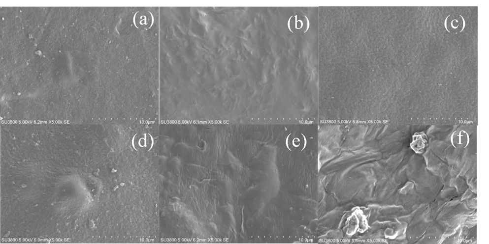 SEM images of BSM/HG and 7.5Cu0.7Ag0.3O/BSM/HG films with a 5000 magnification are presented in Figure 5. The morphology of the pure HG film was rough with a non-porous structure (Figure 5(a)). For BSM/HG films with various concentrations of BSM, film roughness increases with BSM content (Figures 5(b) - (d)), particularly in 0.7BSM/HG (Figure 5(c)) and 0.9BSM/HG (Figure 5(f)) samples. This could be due to agglomeration of BSM particles. The 0.5BSM/HG film sample seems to have the best composition with smooth and non-porous surfaces, indicating a good distribution of BSM particles in the hydrogel matrix. Moreover, SEM imagery of the Cu0.7Ag0.3O/BSM/HG film (Figure 5(g)) showed rough and non-porous surfaces. However, Cu0.7Ag0.3O particles were not observed using this technique.