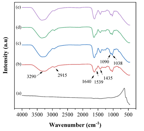 Figure 7 shows the FT-IR spectra of a Cu0.7Ag0.3O/BSM/HG film. The peaks of all samples are less distinct. The broad peaks between 3000 and 3600 cm-1, and 1626 cm-1 correspond to stretching and bending vibrations of the hydroxyl (OH-) groups of alginate, gelatin, BSM and PEG. The small peak at 2915 cm-1 is attributed to C H stretching. Peaks at 1640 and 1539 cm-1 can be ascribed to the C=O and C N stretching vibration of gelatin. Bands at 1640, 1435 and 1038 cm-1 indicate C OO asymmetric stretching vibrations of free carboxylate, C OO symmetric stretching, and C O C stretching of BSM and alginate, respectively [18,35].