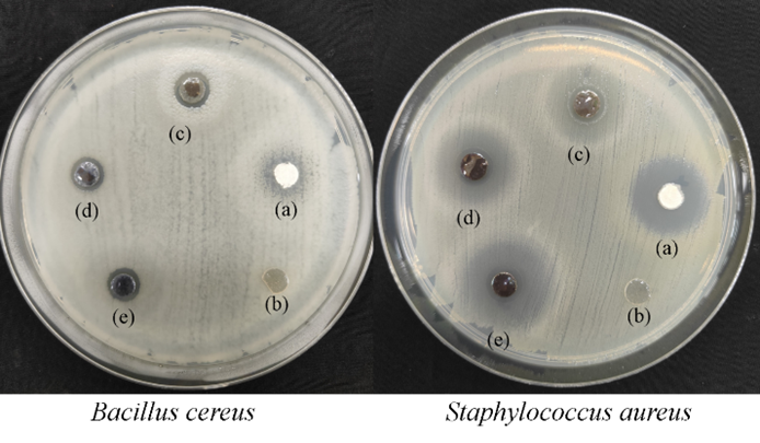 Figure 9 Imagery of the antibacterial activity of Cu0.7Ag0.3O/BSM/HG against Bacillus cereus and Staphylococcus aureus: (a) Positive control, (b) BSM/HG, (c) 3.75Cu0.7Ag0.3O/BSM/HG, (d) 7.50Cu0.7Ag0.3O/BSM/HG and (e) 15.0 Cu0.7Ag0.3O/BSM/HG.