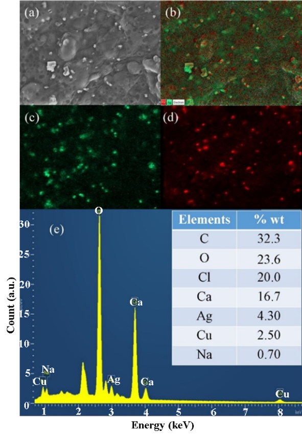 Elemental distribution of Ag and Cu in the 7.5 Cu0.7Ag0.3O/BSM/HG film was analyzed using EDS mapping. These results are shown in Figure 6, where Cu and Ag particles in the hydrogel matrix were homogeneously distributed. Moreover, the major constituents of 7.5 Cu0.7Ag0.3O loaded BSM/HG films were C, O, Cl and Ca. The presence of C may be due to the carbon tape used on the SEM stub during analysis as well as substances incorporated in the hydrogel films (PEG, sodium alginate, gelatin, BSM). Trace amounts of Na in the samples are due to NaCl used in the preparation of hydrogel film. Trace amounts of Cu and Ag were also detected.