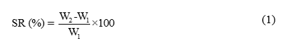 The swelling ratio of the Cu0.7Ag0.3O/BSM/HG film is shown in Figure 8(A). The swelling ratio of BSM/HG was 2102 %. In Cu0.7Ag0.3O loaded HG, the swelling ratios of all samples decreased approximately fourfold compared to that of BSM/HG. This decreased swelling capacity is presumably due to weakened mechanical interactions between the Cu0.7Ag0.3O particles and the hydrogel matrix, as well as nanoparticle agglomeration. Cu0.7Ag0.3O particles can occupy the mesh space or pore volume within the gel network, thereby hindering diffusion and penetration into the matrix [36]. Although high-resolution SEM or image-based analysis was not performed in this work, similar observations and interpretations have been reported in previous studies [36,37].