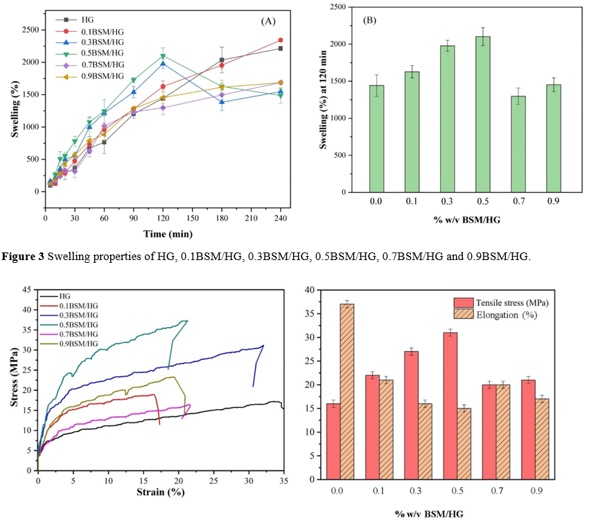 Figure 8 (A) Swelling, and (B) tensile properties of Cu0.7Ag0.3O/BSM/HG.