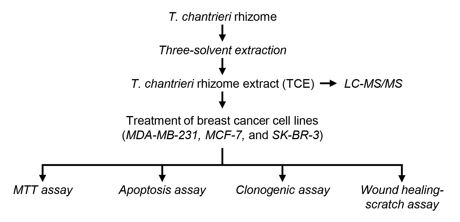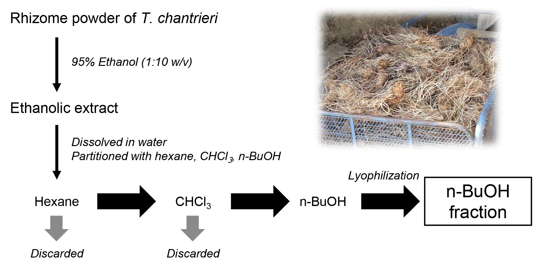 Fresh rhizomes of T. chantrieri purchased from a local cultivator in Chiang Rai Province, Thailand, were taxonomically authenticated by Dr. Chaiyong Rujjanawate as identical to voucher specimen No. 168-M, which has been deposited at the School of Medicine Herbarium, Mae Fah Luang University, Thailand. Fresh rhizomes were thoroughly cleaned, coarsely chopped, shade-dried, and ground into a coarse powder. The powdered rhizome was then subjected to extraction with 95% ethanol, and the solvent was subsequently removed under reduced pressure using a rotary evaporator. After ethanol removal, the dried crude extract was dissolved in distilled water and subjected to liquid-liquid partitioning. The aqueous solution was extracted 3 times with an equal volume of hexane, and the hexane layers were discarded. The remaining aqueous phase was extracted 3 times with dichloromethane, and those fractions were also discarded. Finally, the residual aqueous layer was extracted 3 times with n-butanol. The combined n-butanol extracts were evaporated under reduced pressure at 40 °C and then lyophilized to yield the final n-butanol-soluble fraction for subsequent assays. This 3-solvent extraction protocol was adapted from a previously established method that effectively separates plant constituents by polarity [8]. The extraction process is presented in Figure 1. The lyophilized extract was reconstituted in deionized water and filtered through a 0.2 μm syringe filter before cell treatment. A schematic diagram of the experimental design is illustrated in Figure 2.