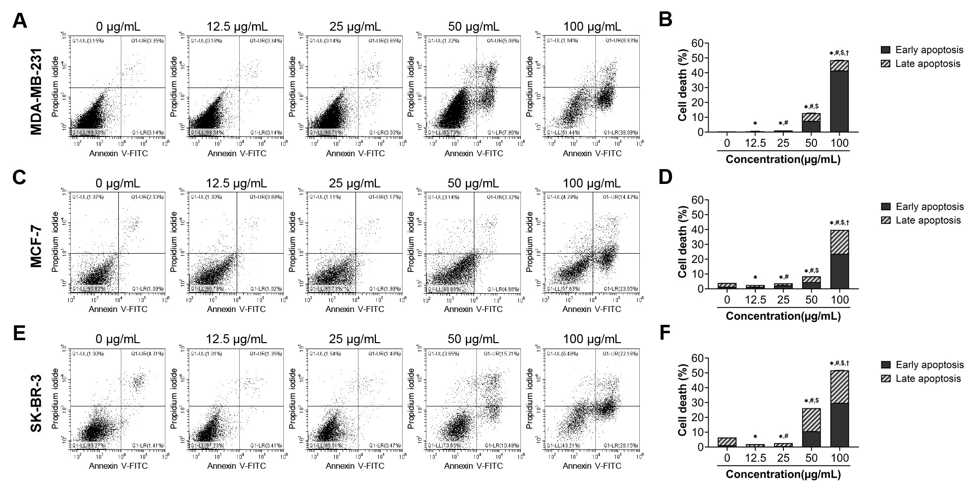 Figure 4 The percentage of apoptotic breast cancer cells after treatment with TCE for 24 h. Annexin V and PI staining were performed on MDA-MB-231, MCF-7, and SK-BR-3 cells after 24 h of TCE treatment. Representative flow cytometry dot plots of annexin V and PI-stained cells in MDA-MB-231 (A), MCF-7 (C), and SK-BR-3 (E). The percentage of apoptotic cells in MDA-MB-231 (B), MCF-7 (D), and SK-BR-3 (F). Data are expressed as mean ± SD (N = 3). * p < 0.05 vs. the untreated control (0 µg/mL), # p < 0.05 vs. 12.5 µg/mL, $ p < 0.05 vs. 25 µg/mL, † p < 0.05 vs. 50 µg/mL.