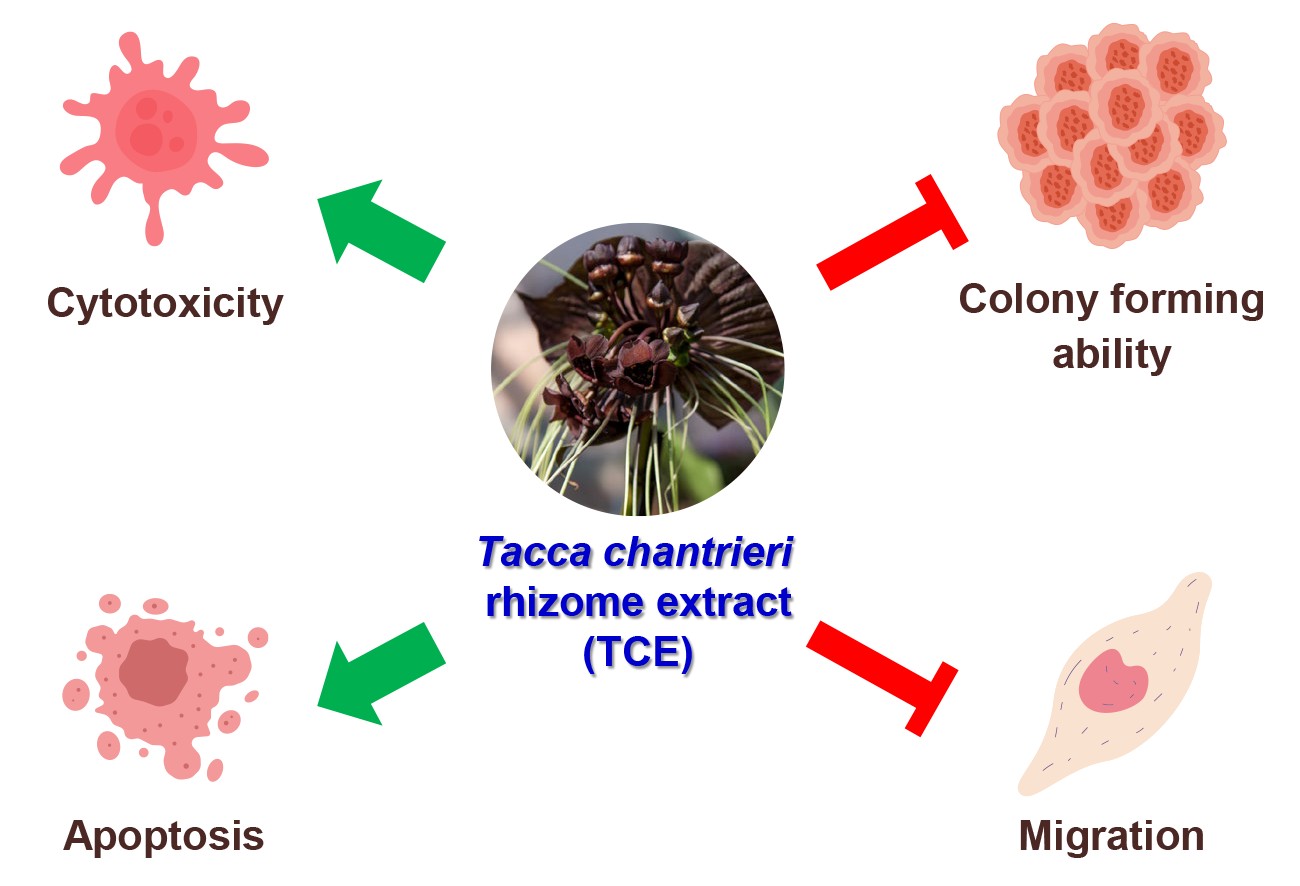 Tacca chantrieri, known as the “black bat flower,” is a herbaceous plant found in the tropical forests of several Southeast Asian countries [5,6]. The rhizome of this plant has been traditionally used in medicine to alleviate muscle pain, abdominal discomfort, food poisoning, skin diseases, burns, diarrhea, stomach ulcers, and inflammation [7-10]. Studies have revealed that T. chantrieri contains several bioactive compounds with anti-cancer activities, including saponins, taccalonolides, withanolides, diarylheptanoids, and diarylheptanoid glucosides [11-13]. These compounds have demonstrated cytotoxic effects against various cancer cell types, highlighting T. chantrieri as a promising candidate for cancer treatment. Notably, an ethanol extract of T. chantrieri rhizome has been found to exhibit anti-cancer activity and enhance the effects of cisplatin in cholangiocarcinoma cells [14].