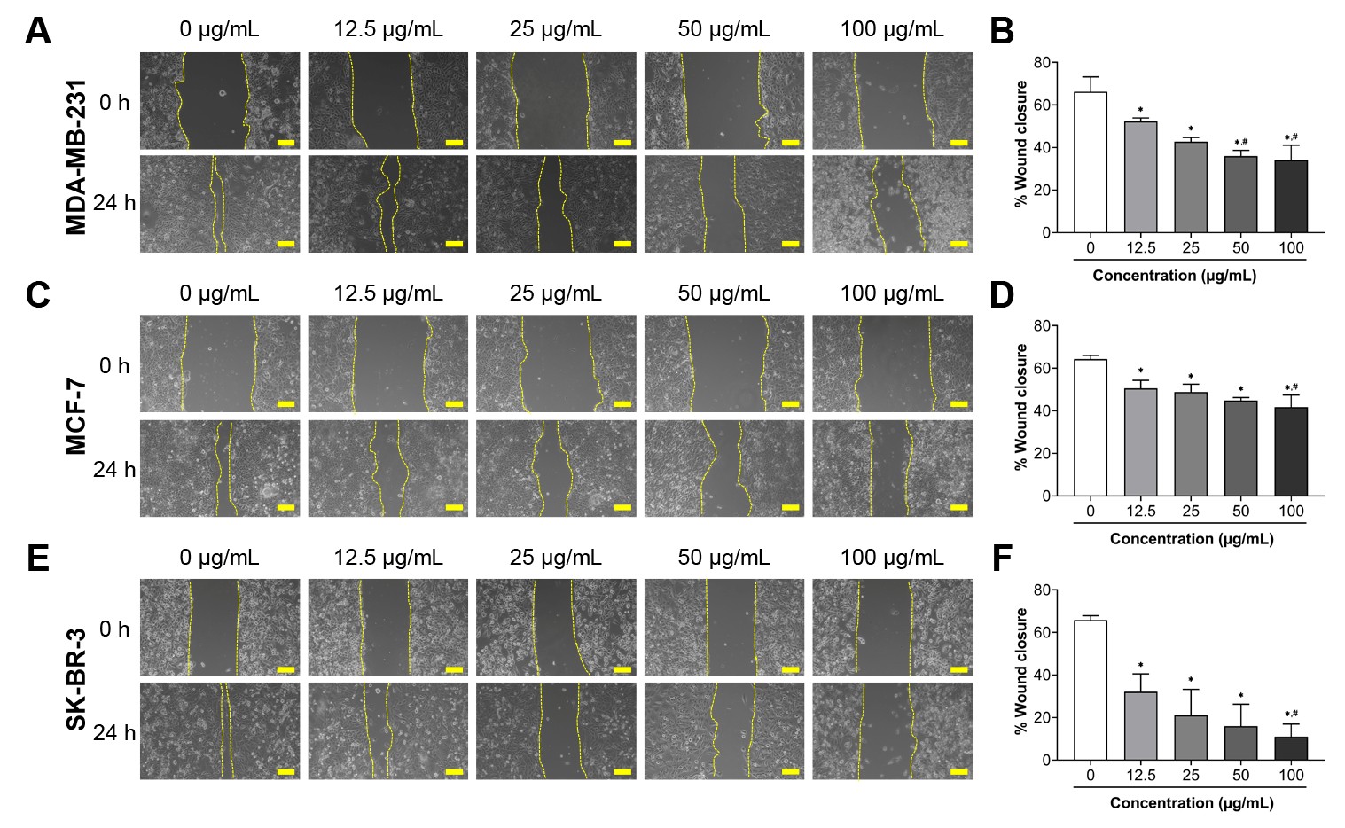 Figure 6 Migration of breast cancer cells after treatment with TCE for 24 h. A wound healing-scratch assay was conducted on MDA-MB-231, MCF-7, and SK-BR-3 cells after 24 h of TCE treatment. Representative images of the wound area before treatment (0 h) and after 24 h of treatment in MDA-MB-231 (A), MCF-7 (C), and SK-BR-3 (E). Scale bar = 100 µm. The percentage of wound closure in MDA-MB-231 (B), MCF-7 (D), and SK-BR-3 (F). Data are expressed as mean ± SD (N = 3). * p < 0.05 vs. the untreated control (0 µg/mL), # p < 0.05 vs. 12.5 µg/mL.